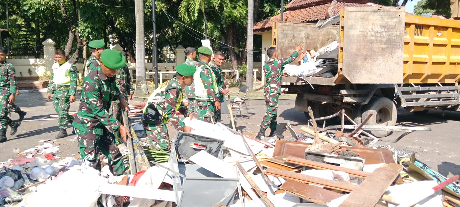 Kegiatan pembersihan dilakukan sejak pagi hari sebagai bagian dari upaya percepatan pemulihan fasilitas umum yang rusak akibat aksi massa. Para anggota Koramil bekerja sama dengan instansi terkait lainnya untuk membersihkan puing-puing, membenahi halaman gedung, dan mengamankan dokumen-dokumen yang berserakan.