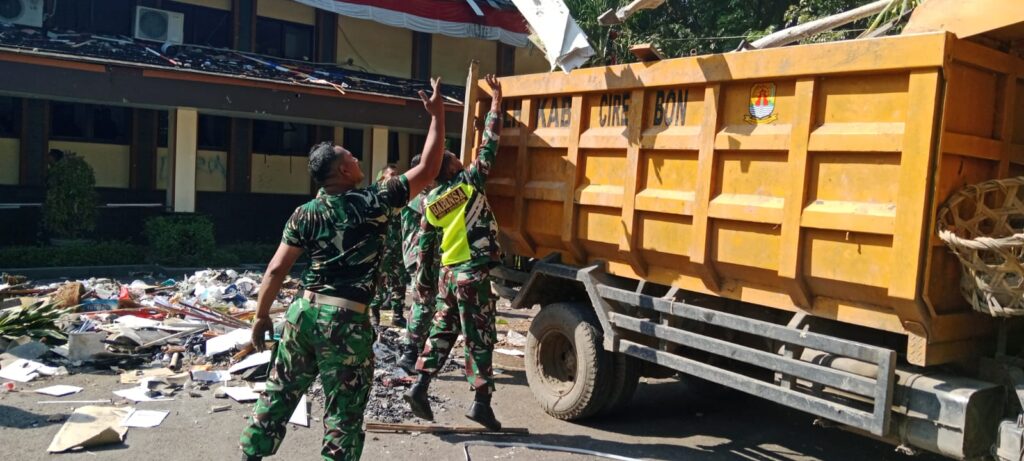Cirebon, 2 September 2025 – Pasca kerusuhan yang terjadi dalam unjuk rasa di Kantor DPRD Kabupaten Cirebon pada 30 Agustus 2025 lalu, jajaran TNI dari Koramil 0620-13/Sumber yang berada di bawah naungan Kodim 0620/Kab. Cirebon turun langsung membantu proses pembersihan dan pemulihan fasilitas gedung DPRD.