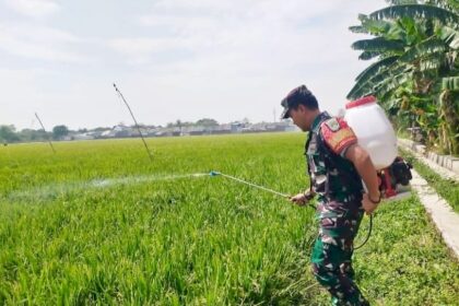 Babinsa Dampingi Poktan Sirandu Jaya Lakukan Penyemprotan Hama Padi Dukung Ketahanan Pangan Nasional