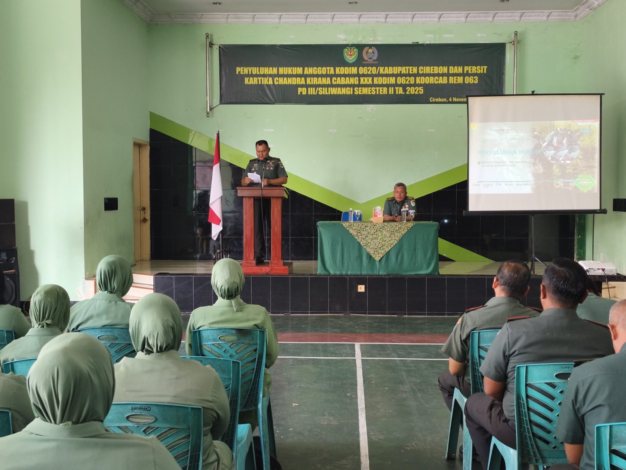 Cirebon, 4 November 2025, Dalam rangka meningkatkan pemahaman dan kesadaran hukum di lingkungan TNI AD, Kodim 0620/Kab. Cirebon menyelenggarakan kegiatan Penyuluhan Hukum bagi prajurit dan Persit Kartika Chandra Kirana Cabang XXX Kodim 0620 Koorcab Rem 063 PD III/Siliwangi. Kegiatan tersebut berlangsung di Aula GSG Jati Manunggal Kodim 0620/Kabupaten Cirebon (4/11)